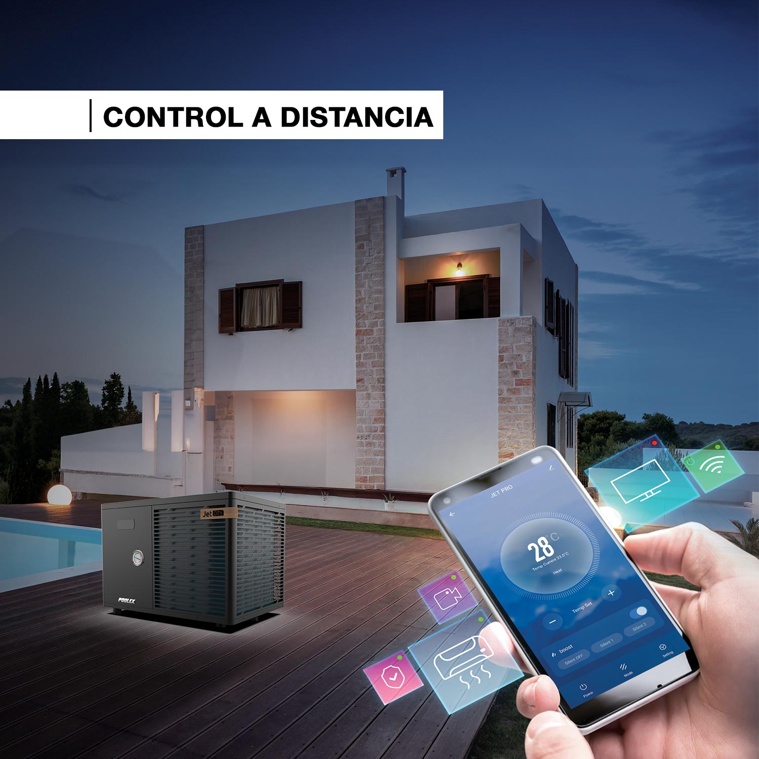 La bomba de calor JET CITY se conecta directamente a su Wi-Fi y se controla completamente a distancia a través de la aplicación POOLEX. Acceda a todos los ajustes de su bomba en su smartphone, ajustando parámetros como la temperatura del agua o programando sesiones de calefacción para ahorrar energía. También recibirá notificaciones y alertas para un seguimiento óptimo de su equipo.