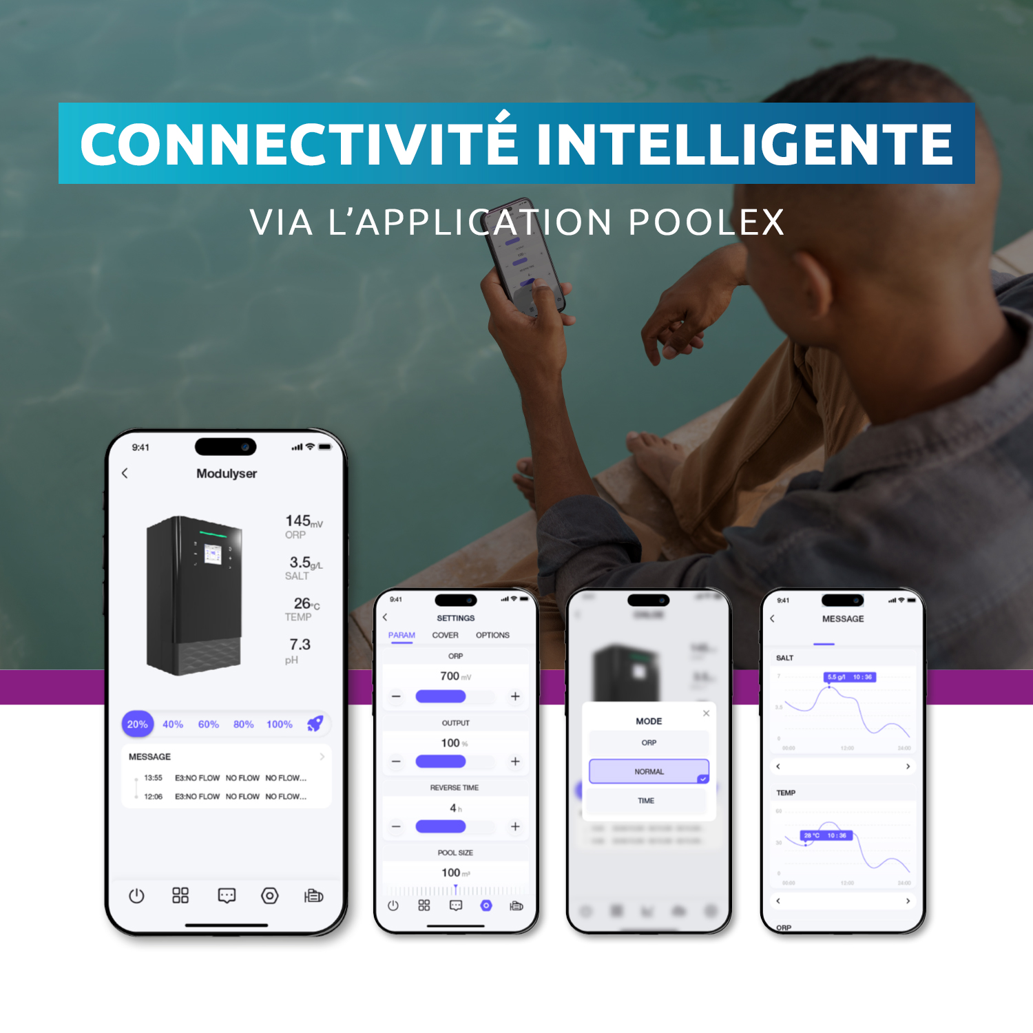 Connecté en WiFi & Cloud via l’application Poolex, le Modulyser permet un pilotage à distance complet, l’accès aux données en temps réel et des mises à jour automatiques OTA.