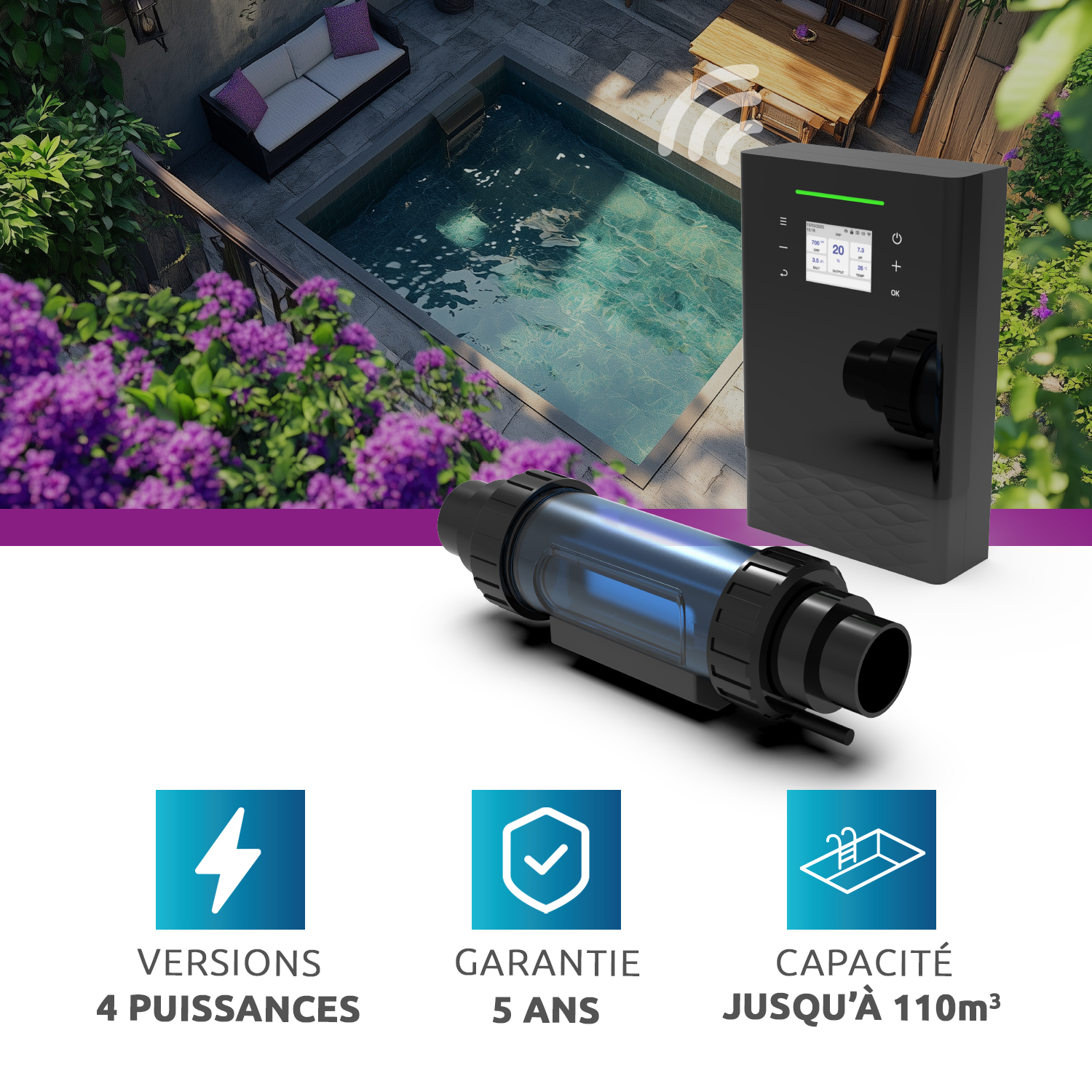 L’inversion de polarité automatique et réglable (4, 8 ou 12 heures) limite l’entartrage et prolonge la durée de vie des cellules jusqu’à 10 000 heures.