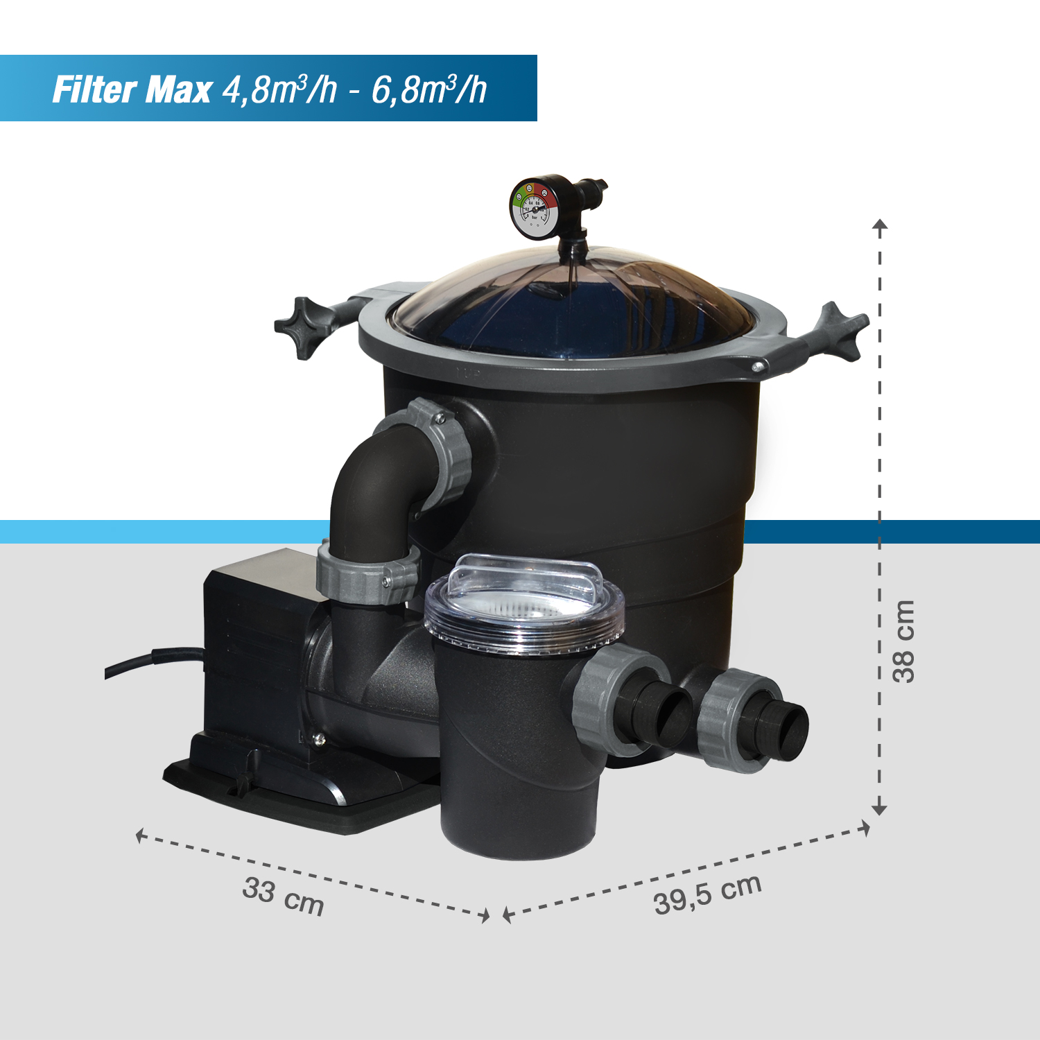 | Vitesse de filtration | 4,8m³/h | 6,8m³/h | 8m³/h | 10m³/h | ||